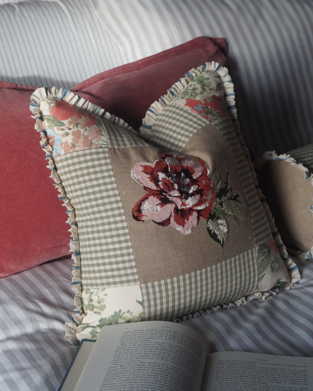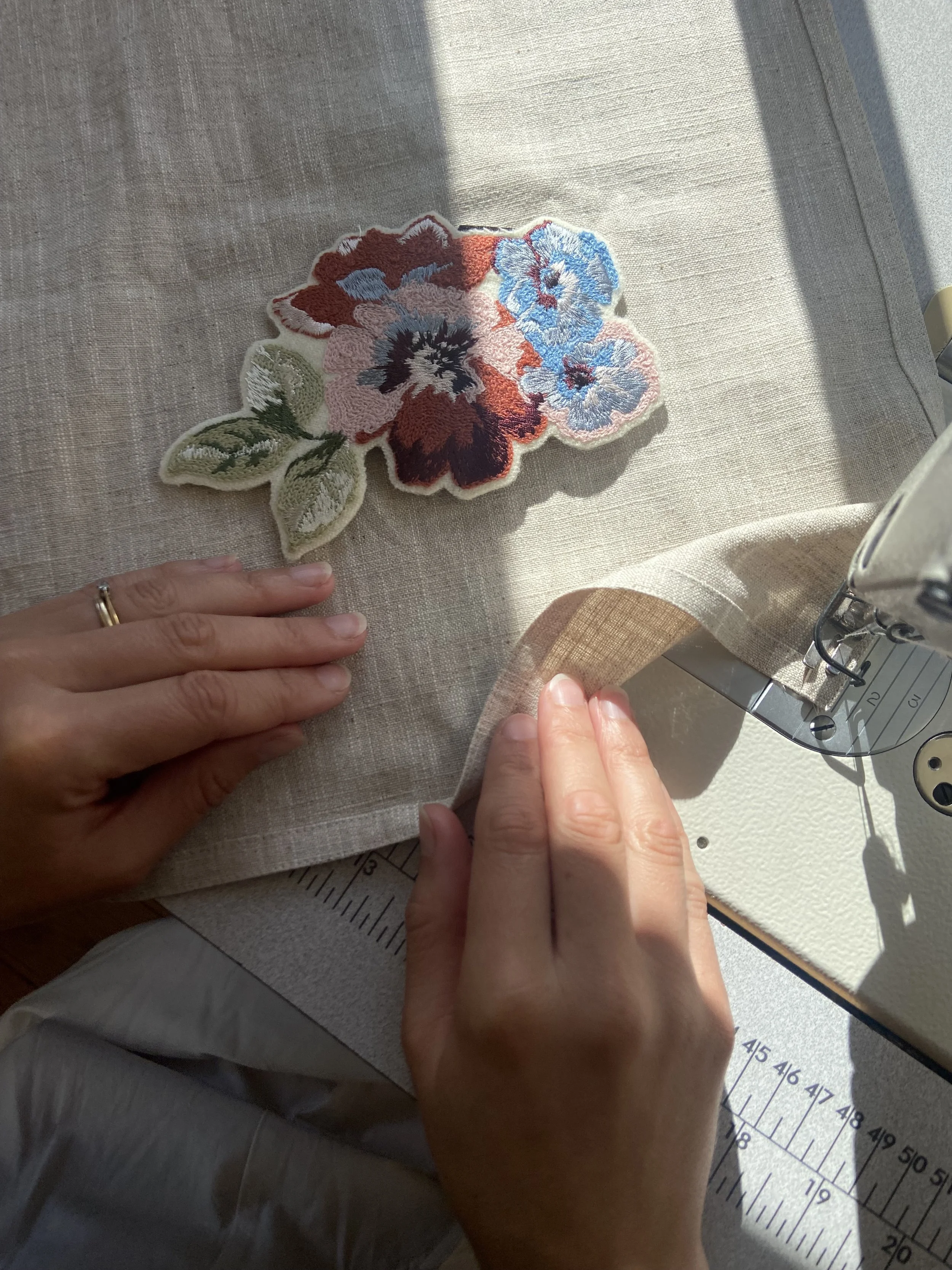Inspired by rural life, memory, and the Scottish landscape, motifs are drawn from moments both personal and familiar — garden flowers, countryside walks, and the quiet details of everyday life. Sketches are refined carefully before being translated into embroidery, allowing space for texture, balance, and playfulness to develop.
